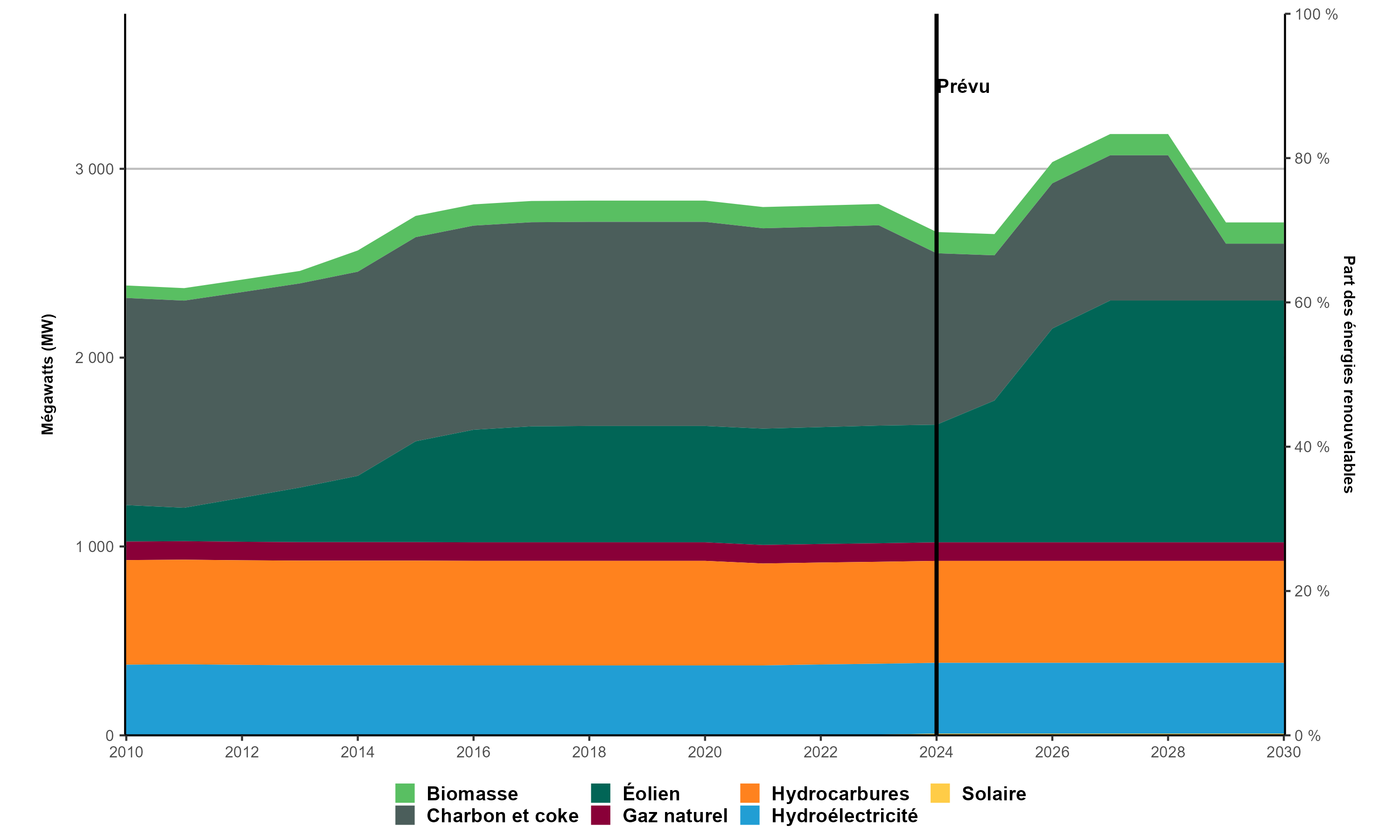 Version texte : Le graphique présente la capacité de production d’électricité en Nouvelle‑Écosse de 2010 à 2030. En 2010, la capacité installée totale de production d’électricité de la province s’établissait à 2 382 MW, dont 26,6 % à partir d’énergies renouvelables. En 2023, elle a atteint 2 813 MW (39,6 % d’énergies renouvelables). Selon les ajouts prévus, la capacité devrait atteindre 2 716 MW (65,4 % à partir d’énergies renouvelables) en 2030.